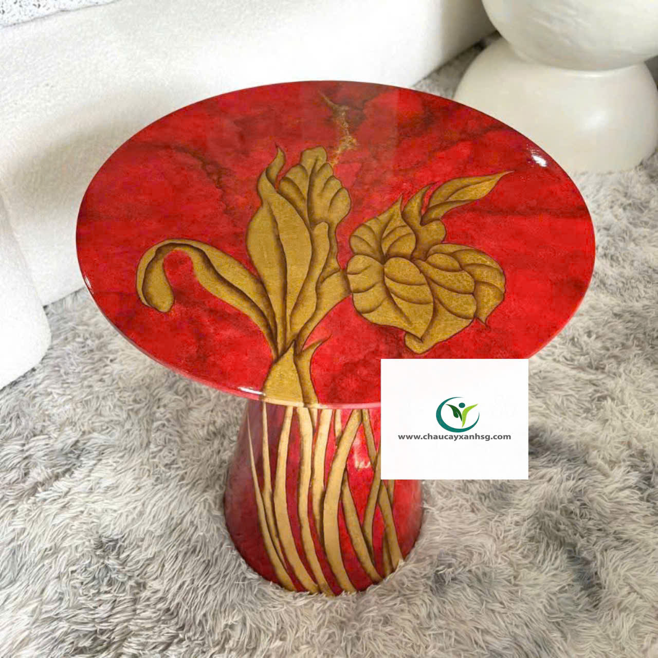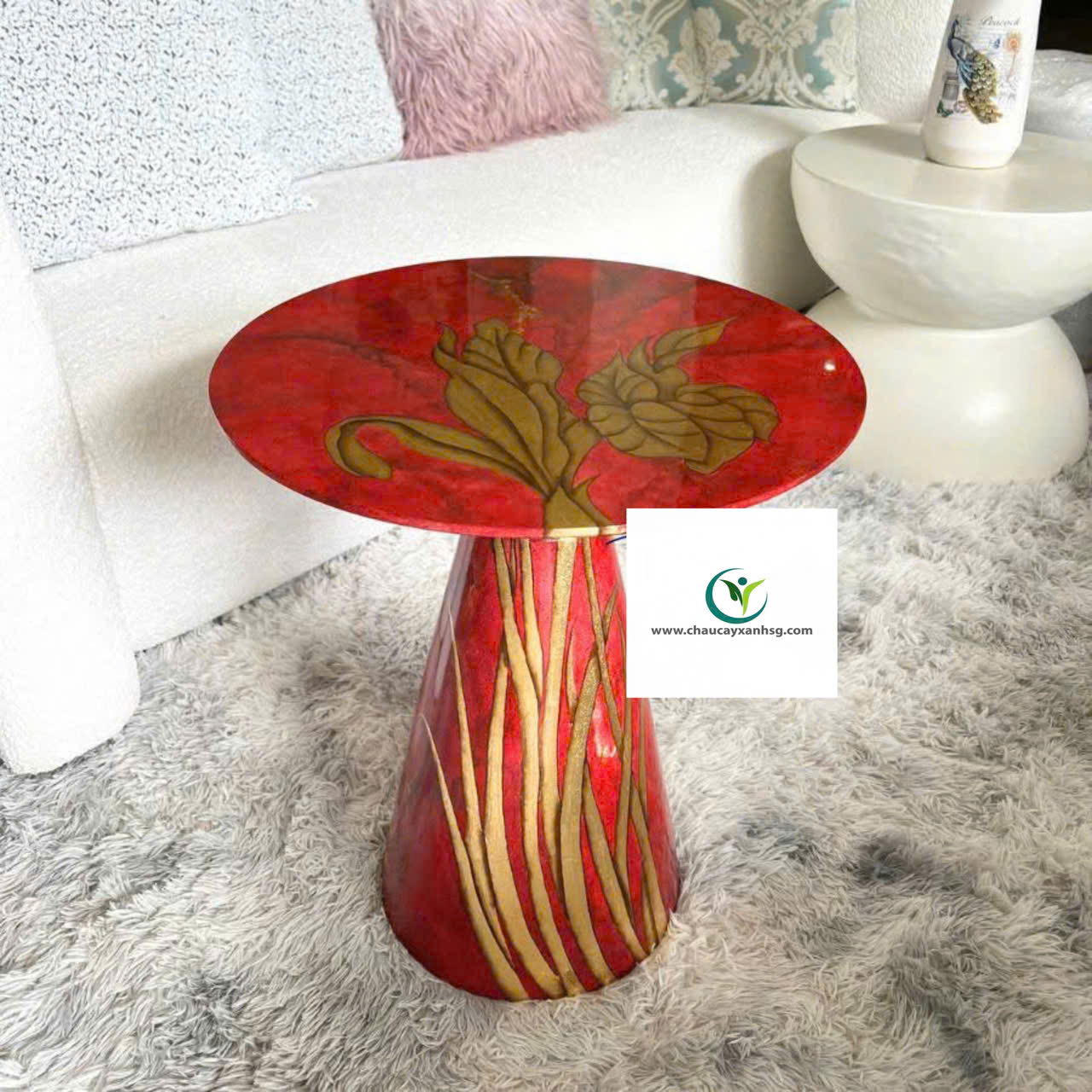 Bàn đá terrazzo họa tiết hoa lá nghệ thuật, kích thước 40x50cm, gam đỏ nổi bật kết hợp vàng ánh kim sang trọng, bền đẹp và dễ phối hợp nhiều không gian.