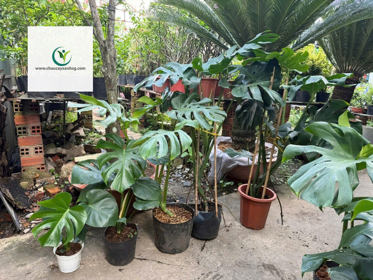 Monstera nổi bật với lá lớn, xanh đậm, có các đường xẻ tự nhiên rất nghệ thuật. Cây thường mọc dạng bụi hoặc leo, tạo cảm giác xanh mát và cực kỳ “chill” cho không gian.